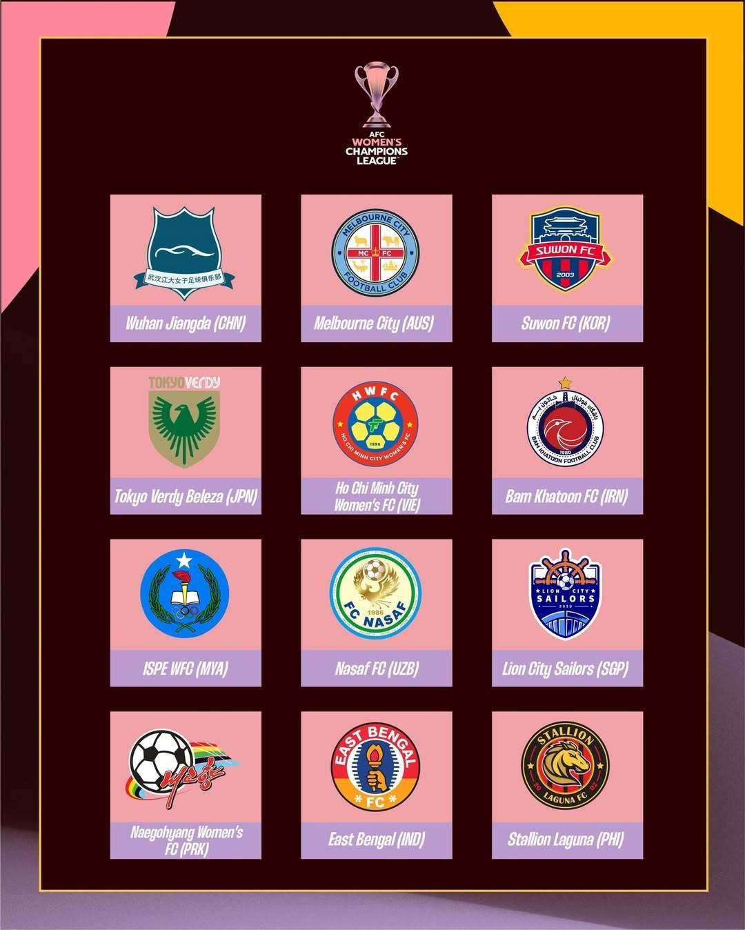 参加本届女足亚冠的共12支球队由亚足联技术排名前6的球队以及通过预赛晋级的6支球队组成,武汉车谷江大作为上赛季的女足亚冠冠军,将开启自己的卫冕之旅,日本的东京绿茵美人、缅甸的瓦城体育学院、新加坡的狮城水手、乌兹别克斯坦的纳萨夫、印度的东孟加拉、韩国的水原FC、菲律宾的内湖公马以及朝鲜的故乡都将是首次亮相女足亚冠小组赛,东孟加拉、水原FC、内湖公马和故乡也是首次亮相洲际赛事的舞台。