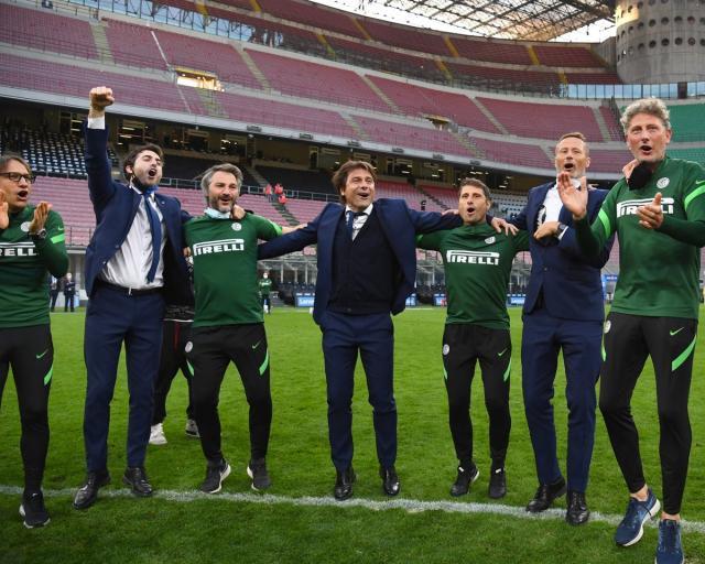 下午4点半左右,随着蓝黑大巴开入球场,球迷们的狂欢达到最高潮。遗憾的是,新冠光景下,狂欢的球迷们没法跟随他们的英雄们开进“足球斯卡拉”;欣慰的是,蓝黑将士在场上的表现,配得上八万人的齐声助威。还记得首回合交手的旧将双响和“菜地”马拉西的鸽群吗?上一次蓝黑在联赛中败北,对手正是拉涅利的球队。一切宛如昨日,但至今已经又踢了整整一个循环,孔蒂的球队交出的成绩单是:15胜4平!
